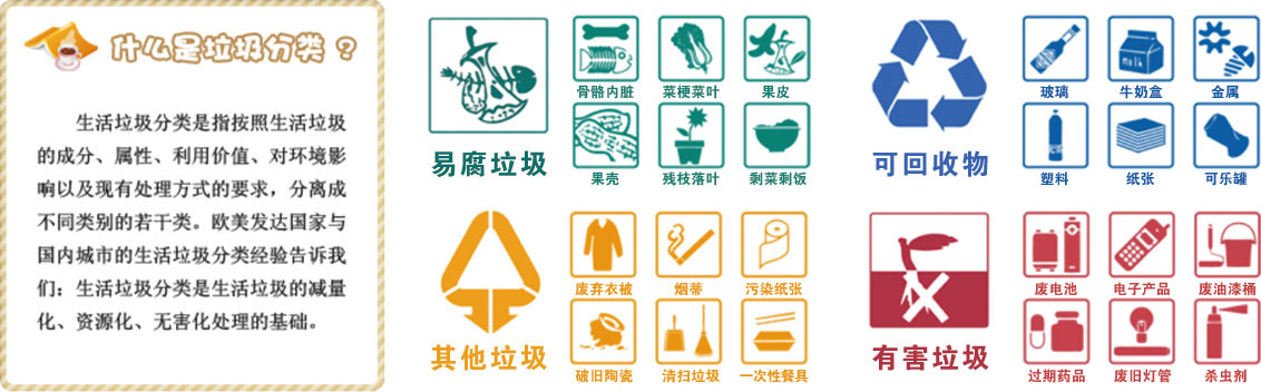 生活垃圾分类是指按照垃圾的不同成分、属性、利用价值以及对环境的影响,并根据不同处理方式的要求,分成属性不同的若干种类。